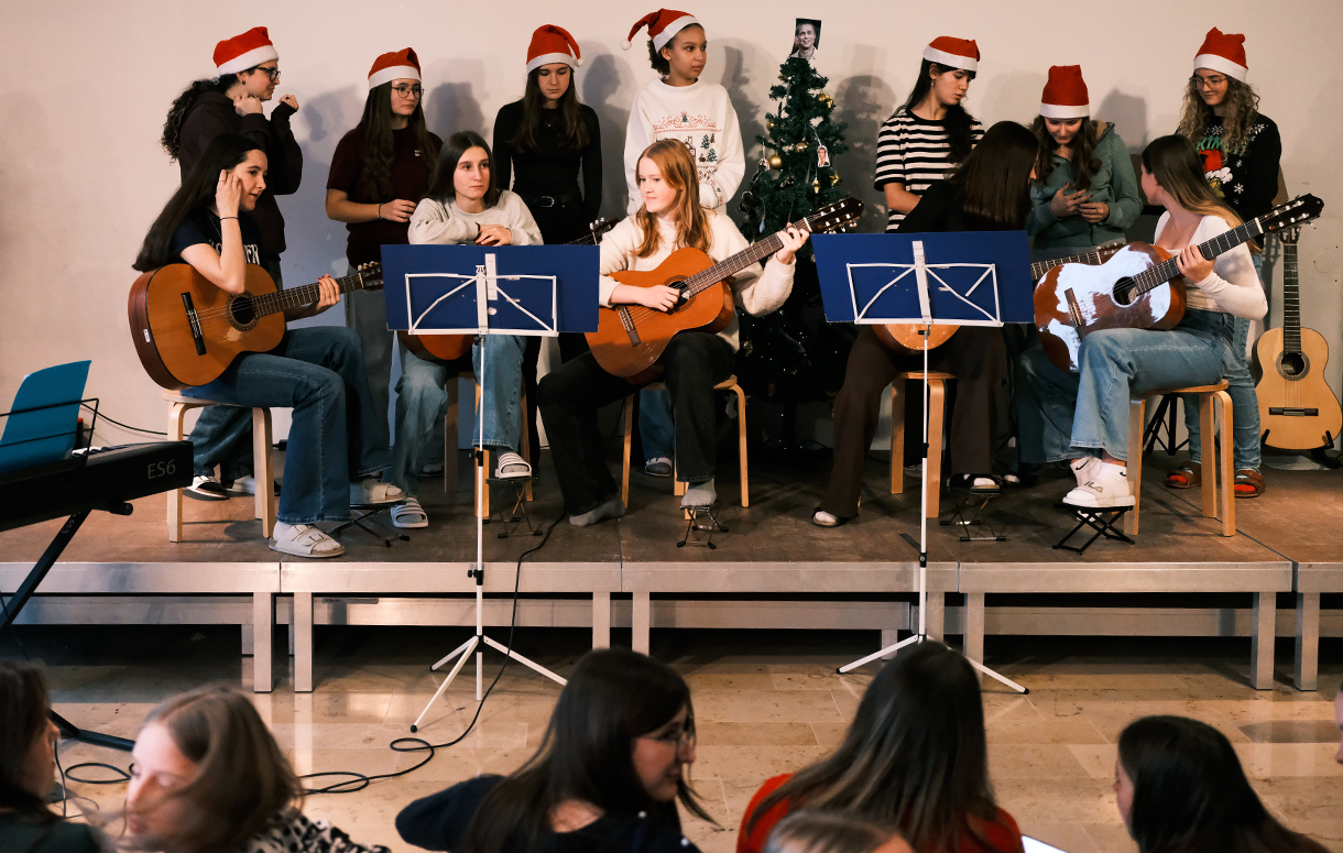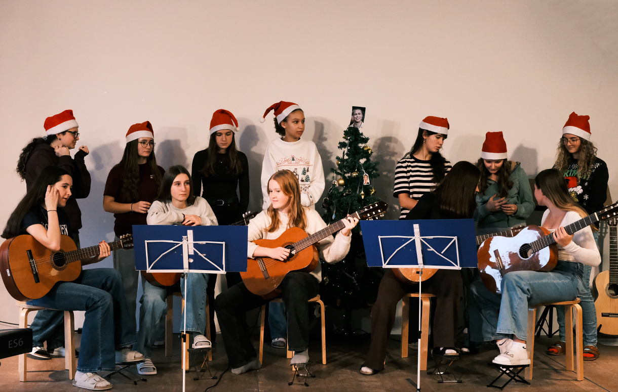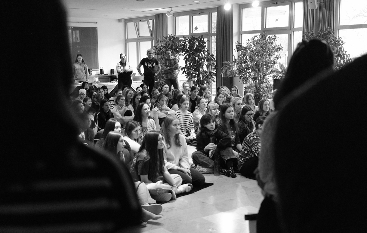Sieh dir das Haus an, die Räume, Lehrerinnen und Lehrer, Schülerinnen und Schüler, Unterricht und das Drumherum.